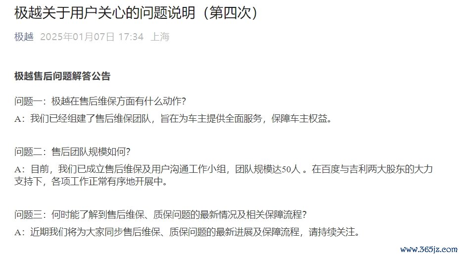 极越汽车:已成立50人售后维保工作小组,获百度与吉利支持