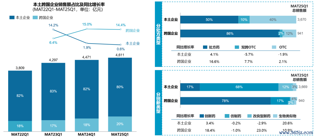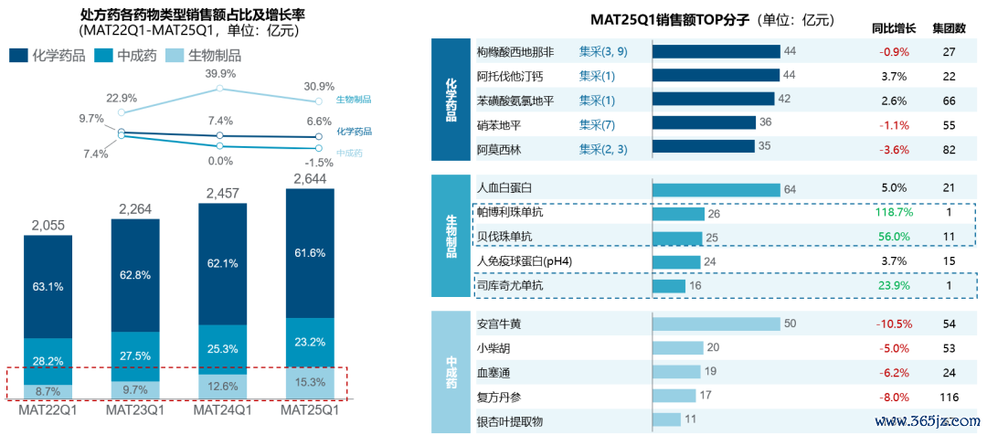零售处方药市场以化药为主导,但生物制品近几年均保持较高增速,份额占比快速提升。生物制剂当前市场份额相较于化药和中成药仍然较小,但受到多个单抗类药物快速增长影响,生物制品在零售渠道的占比节节攀升。受TOP品种销售下滑影响,中成药近两年销售疲软,MAT25Q1呈现下滑趋势。