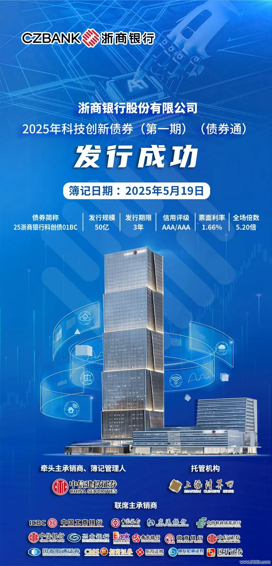 5月19日,浙商银行在全国银行间债券市场成功发行科技创新债券,本期债券发行规模50亿元,期限3年,票面利率1.66%。本期债券的成功发行,是浙商银行聚焦“五篇大文章”,以金融力量服务科技创新的重要举措。债券募集资金将依据适用法律和主管部门的批准,通过贷款、债券等多种途径,专项支持科技创新领域业务。本次发行吸引了国有大型银行、股份制银行、城商行、农商行、理财子、基金、券商、信托等各类投资机构参与认购,最终认购倍数5.20倍,体现了市场对浙商银行做好科技金融大文章的充分认可。