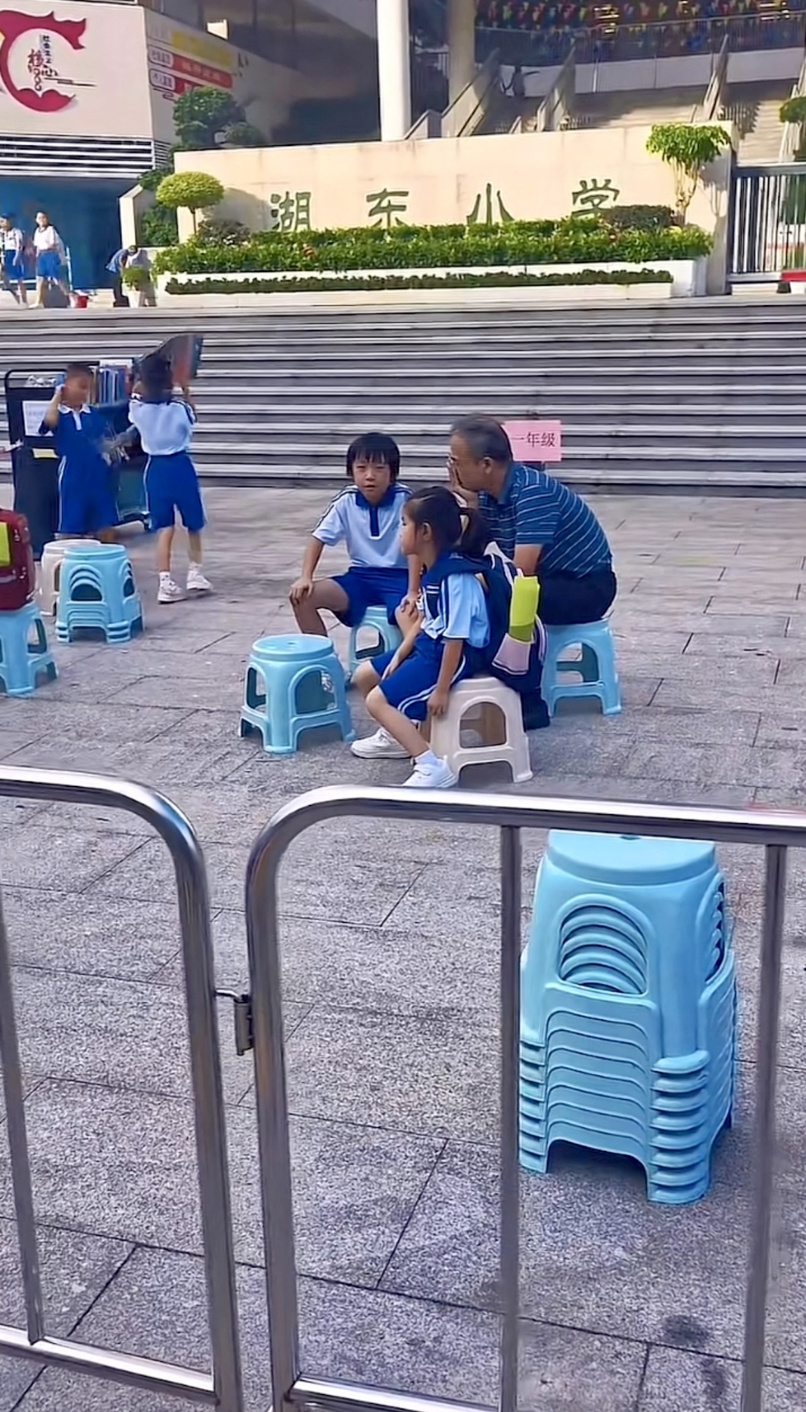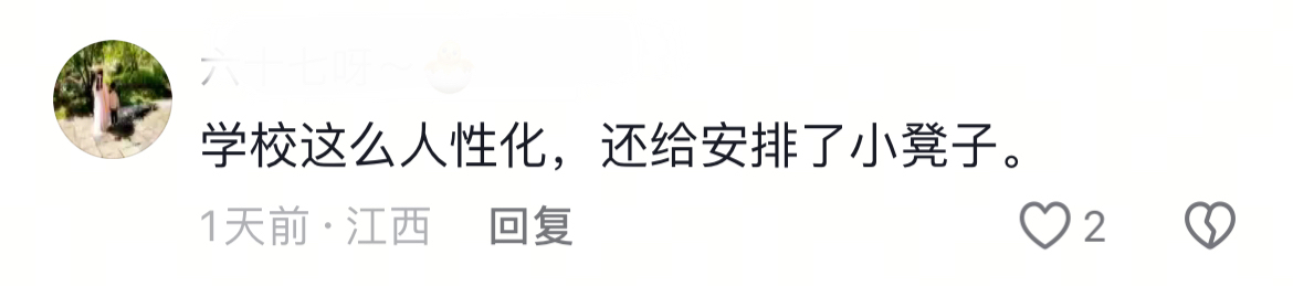 还有人注意到,学校特意在校门口准备了小板凳,供等待的孩子们休息,这一细节也获得点赞。